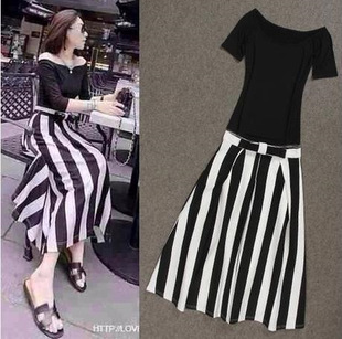 歐洲站2015新款黑白條紋復(fù)古傘形半身長裙一字領(lǐng)露肩T恤套裝 /