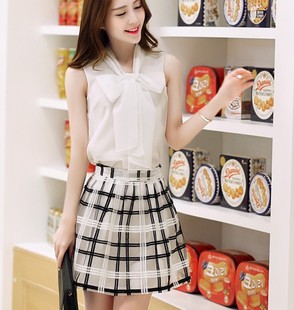 歐洲站 2015夏季 根紗無袖蝴蝶結(jié)上衣刺繡短裙套裝 一件代發(fā) /