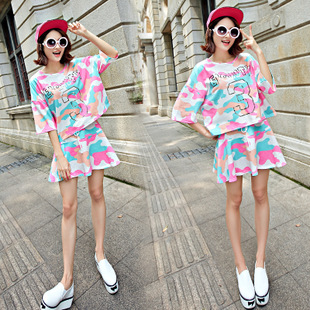 英文燙金迷彩套裝裙純棉寬松t恤+半身傘裙2015夏季新款休閑套裝女 /