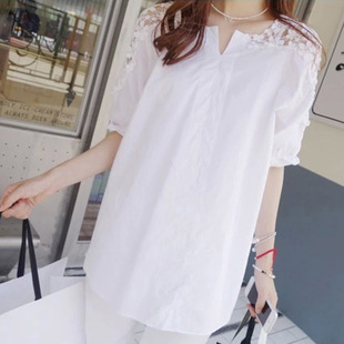 夏裝新款韓版短袖襯衫胖mm加肥加大碼女裝蕾絲T恤純棉白襯衣 /