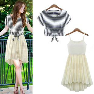 2015新款加肥加大碼女裝胖mm夏裝條紋短袖歐美兩件套套裝雪紡連衣 /
