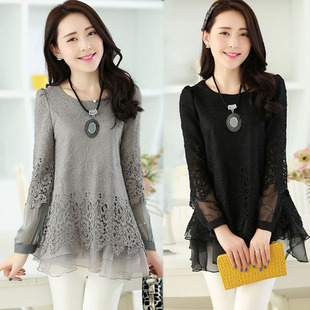 2015新款熱賣韓版t恤寬松蕾絲拼接中長款打底衫女長袖蕾絲衫 /