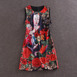 2015夏裝歐美走秀同款 母子印花高貴優(yōu)雅背心連衣裙 /