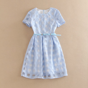 2015春款經(jīng)典格子歐根紗腰帶圓領(lǐng)短袖連衣裙 /