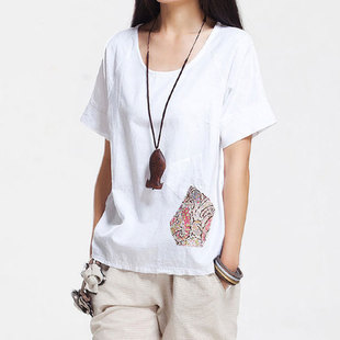 2014新款原創(chuàng)設(shè)計(jì)女裝無印良品森女系口袋拼布棉麻襯衫短袖襯衣 /