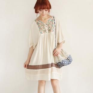 特價(jià)森林系外貿(mào)日單原單刺繡花民族風(fēng)小清新棉麻高腰中袖連衣裙 /