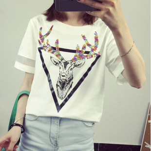 2015韓版短袖t恤女 夏季新款 亮片打底衫 歐根紗短袖 印花棉t恤女 /