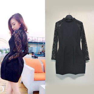 2014秋季新款性感氣質(zhì)優(yōu)雅蕾絲拼接羅馬布燈籠立領(lǐng)連衣裙 /