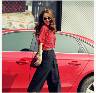 2015夏女裝新款 優(yōu)雅格紋立領(lǐng)上衣+顯瘦闊腿褲時(shí)尚OL套裝 /
