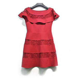 2015早春新款蕾絲羅馬拼接修身性感披肩蛋糕連衣裙玫紅酒紅裙 /