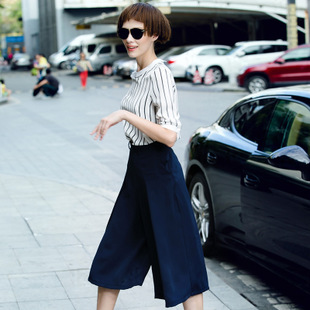 2015夏裝女裝新款 小翻領(lǐng)條紋上衣+顯瘦闊腿褲時(shí)尚OL套裝 /
