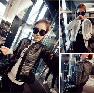 韓版網(wǎng)格鏤空開衫長袖短外套百搭寬松顯瘦防曬衣女棒球服 /