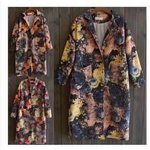 原創(chuàng)冬裝 復古文藝女西裝領加絨大衣外套 民族風印花長款棉服袍子 /
