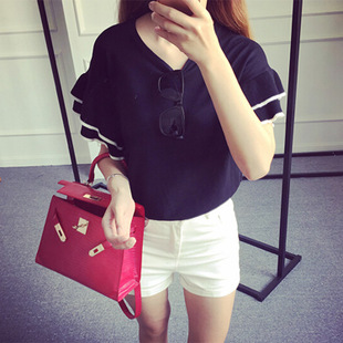 夏季新款女裝簡約圓領(lǐng)顯瘦全棉短袖純色荷葉邊袖短款上衣 /
