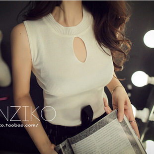 2015新款韓國修身顯瘦女裝 前小洞黑白條紋無袖打底針織背心衫 /