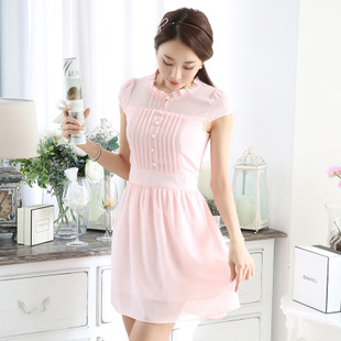 2015夏裝新款甜美雪紡連衣裙立領(lǐng)修身顯瘦短袖連衣裙潮女 /