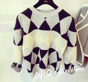 DHR 2014韓國韓版寬松蝙蝠袖復(fù)古菱形格子圓領(lǐng)套頭毛衣F1Q /