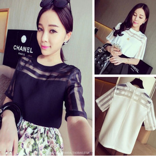 Z1897韓版2014春裝新款 簡(jiǎn)潔百搭透視條紋歐根紗拼接雪紡短袖T恤 /