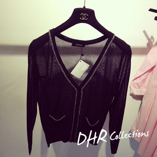 2014春韓國代購韓版修身V領(lǐng)拼接金線薄款原單歐美針織衫開衫 /