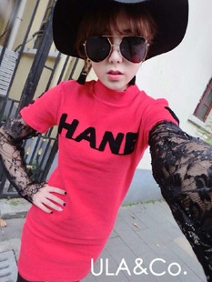 歐洲站2015秋季新款蕾絲袖拼接字母印花中長款女士T恤 /