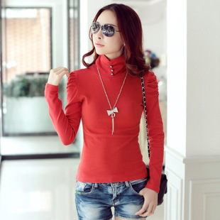 2015秋冬新款純色高領(lǐng)修身保暖打底長袖T恤衫時尚泡泡袖女裝體恤 /