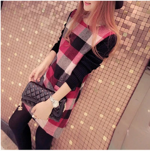 秋冬季新款長袖美裙毛呢連衣裙 中長款女裝顯瘦格子打底裙子 /