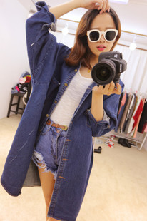 韓國 BF寬松蝙蝠袖水洗長款牛仔風(fēng)衣外套 /
