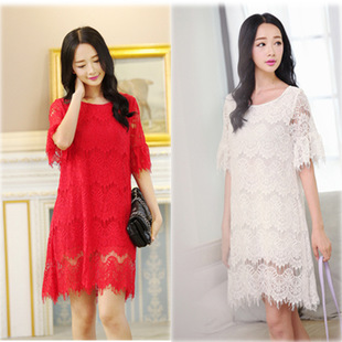 夏季新款歐美街頭拼接勾花縷空蕾絲花瓣短袖中款連衣裙 /