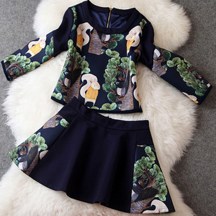 歐洲站秋裝新款女裝太空棉印花時(shí)尚衛(wèi)衣+半身短裙傘裙套裝潮 /