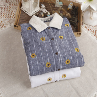 冬季新款日系森女小清新刺繡太陽花加厚保暖加絨襯衫女襯衣 /