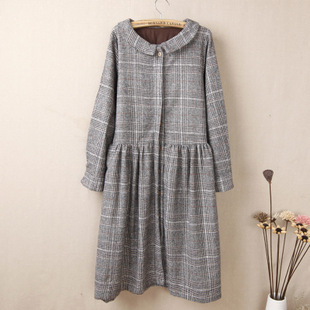 2014秋冬新款復(fù)古娃娃領(lǐng)顯瘦收腰千鳥格長(zhǎng)袖加厚毛呢女式連衣裙 /