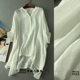 森女文藝范寬松蝙蝠中袖飄逸絲麻樸素棉麻逸開衫防曬衫襯衫 /