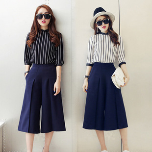 2015春夏新款小香風雪紡上衣+修身闊腿褲時尚休閑兩件套套裝 /