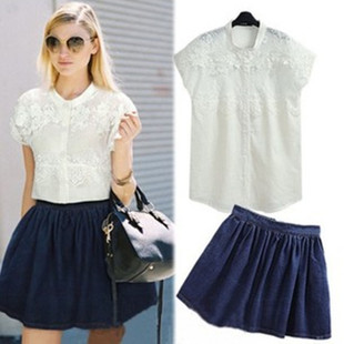 2015歐洲站 棉麻蕾絲拼接女襯衫寬松大擺牛仔裙套廠家直銷 /