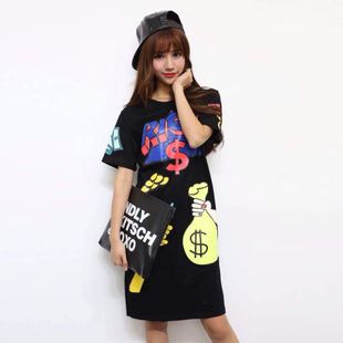 實拍款涂鴉搞怪印花時尚裝飾圓領休閑寬松連衣裙女 /