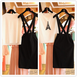 國代購歐洲站水鉆寶石埃菲爾鐵塔T恤背帶包臀連衣裙2件套裝 /