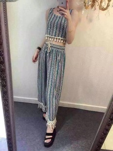 現(xiàn)貨2015夏季新款時尚民族風(fēng)闊腿褲流蘇背心雪紡兩件套裝潮 /