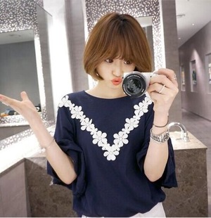 2015韓國東大門代購夏季新款 蕾絲花邊拼接寬松上衣 /