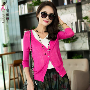 阿蜜姿15年夏裝新胖mm大碼女裝顯瘦條紋鏤空七分袖薄款針織開衫女 /