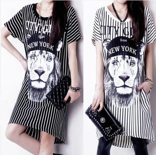 2014歐美大牌獅頭條紋印花短袖打底包臀A字連衣裙 /