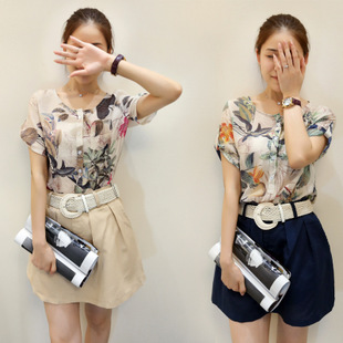實(shí)拍2015夏季韓版女裝寬松顯瘦印花短袖上衣兩件套棉麻套裝連衣裙 /