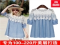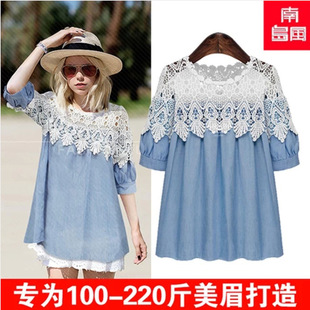 歐美大碼女裝夏裝新款牛仔蕾絲拼接寬松顯瘦連衣裙百褶裙 /