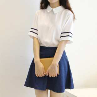 學院風藍白條紋長袖牛仔短裙短褲海軍風套裝女兩件套 /