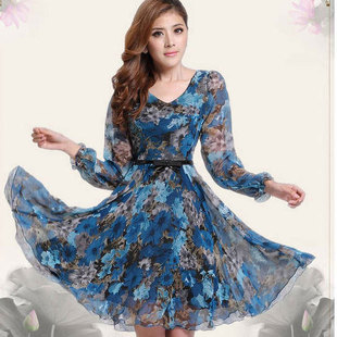 韓版秋款新品 OL修身顯瘦連衣裙大碼女裝 印花雪紡連衣裙 8306# /