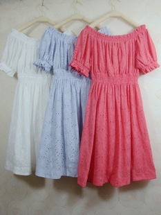 2015 一字領(lǐng)露肩泡泡袖鏤空刺繡連衣裙 /