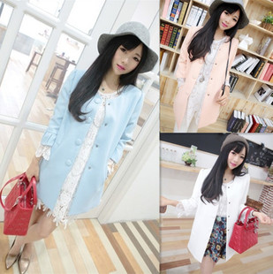 簡介: 建議零售價(jià) ¥70.00 貨號 862 產(chǎn)地 廣州 品牌 自主品牌 主圖來源 實(shí)拍有模特 貨源類別 現(xiàn)貨 是否庫存 是 庫存類型 整單 風(fēng)格 休閑 圖案 純色 面料 棉類混紡 版型 修身型 衣長 中長款(65cm<衣長≤80cm) 領(lǐng)型 圓領(lǐng) 衣門襟 單排扣 袖長 長袖 袖型 常規(guī)袖 流行元素 包扣 工藝 高溫定型 上市年份/季節(jié) 2015春季 顏色 白色,黑色,清新藍(lán),裸粉色 尺碼 均碼