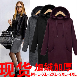 秋冬大碼女裝寬松套頭連帽加厚外套 中長款加絨衛(wèi)衣連衣裙 /