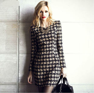 歐美大牌新款氣質(zhì)修身長袖千鳥格女裝連衣裙初秋打底裙 /