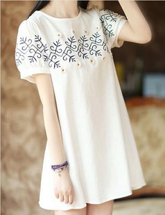 2015森女日系清新寬松刺繡花朵白色學(xué)院風(fēng)短袖棉麻連衣裙 /