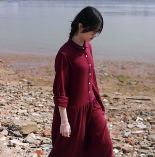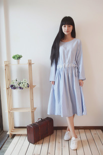 文藝范森系小清新長袖女氣質(zhì)連衣裙 秋修身棉麻長裙 /